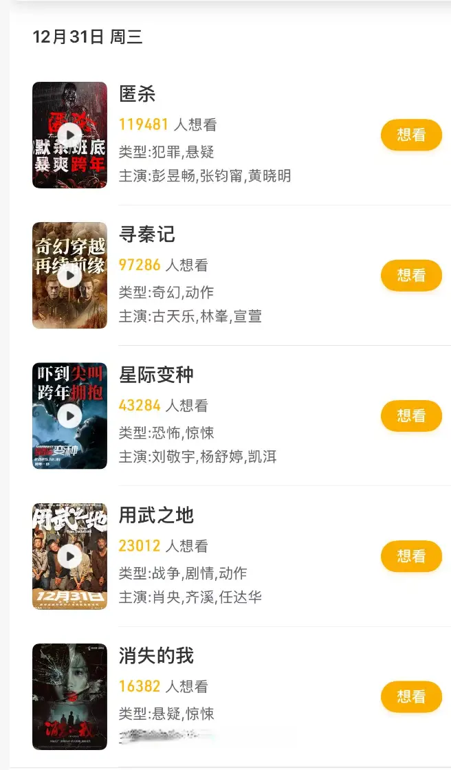 第二大威胁,也来自于国产片的威胁,元旦档期将要上映的电影有《匿杀》《用武之地》《星际变种》和《消失的我》。
